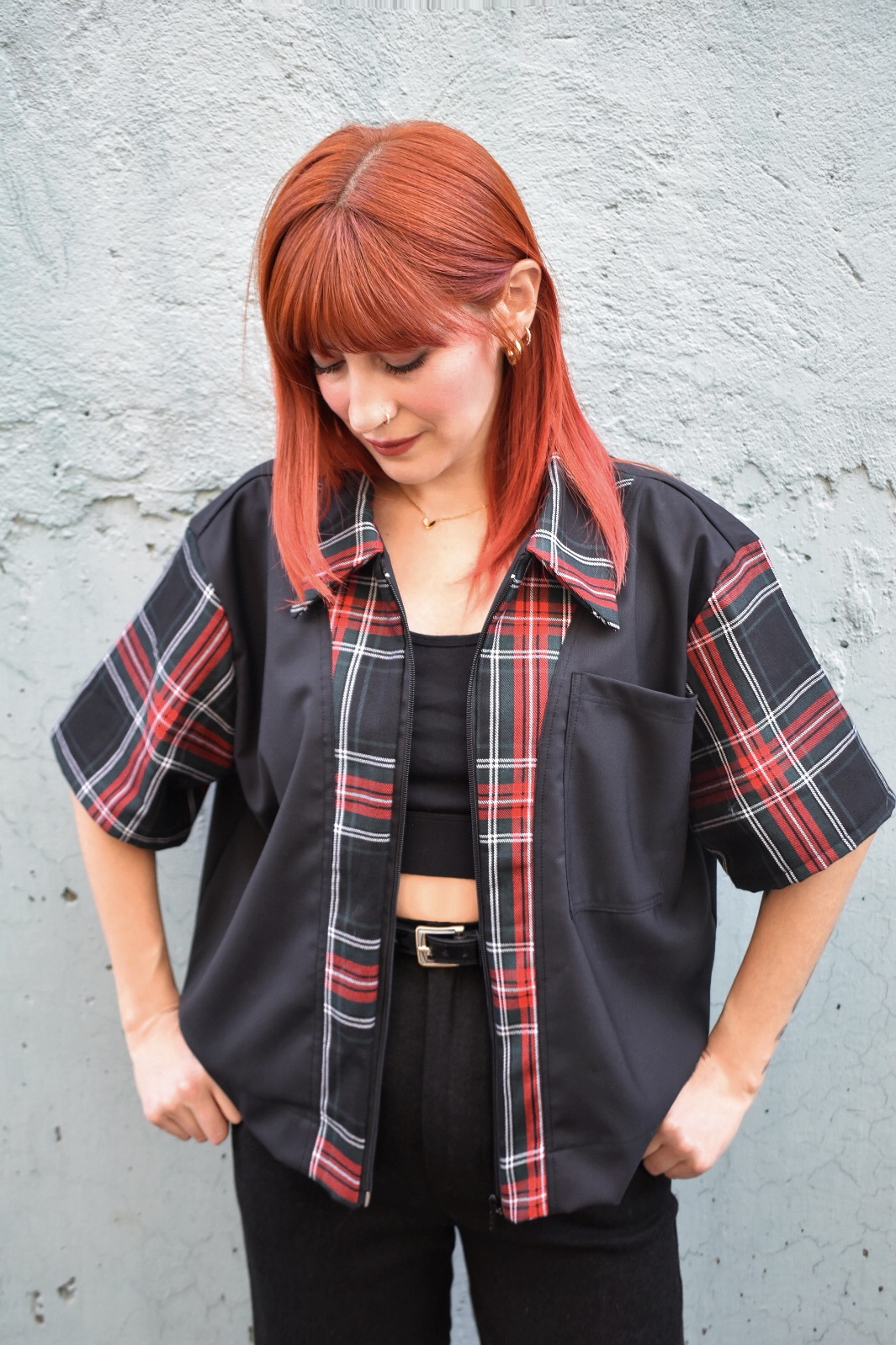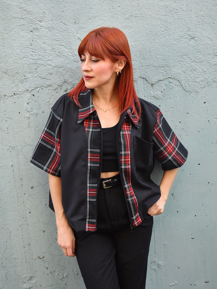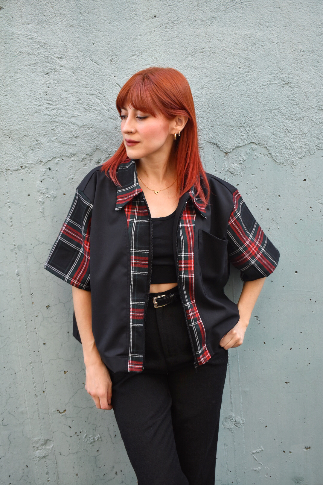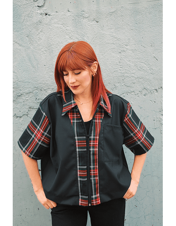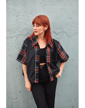 Camisa unisex en bloques en casimir delgado negro con escocés rojo en cuello, frente y mangas. Sensación fresca.