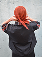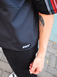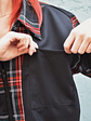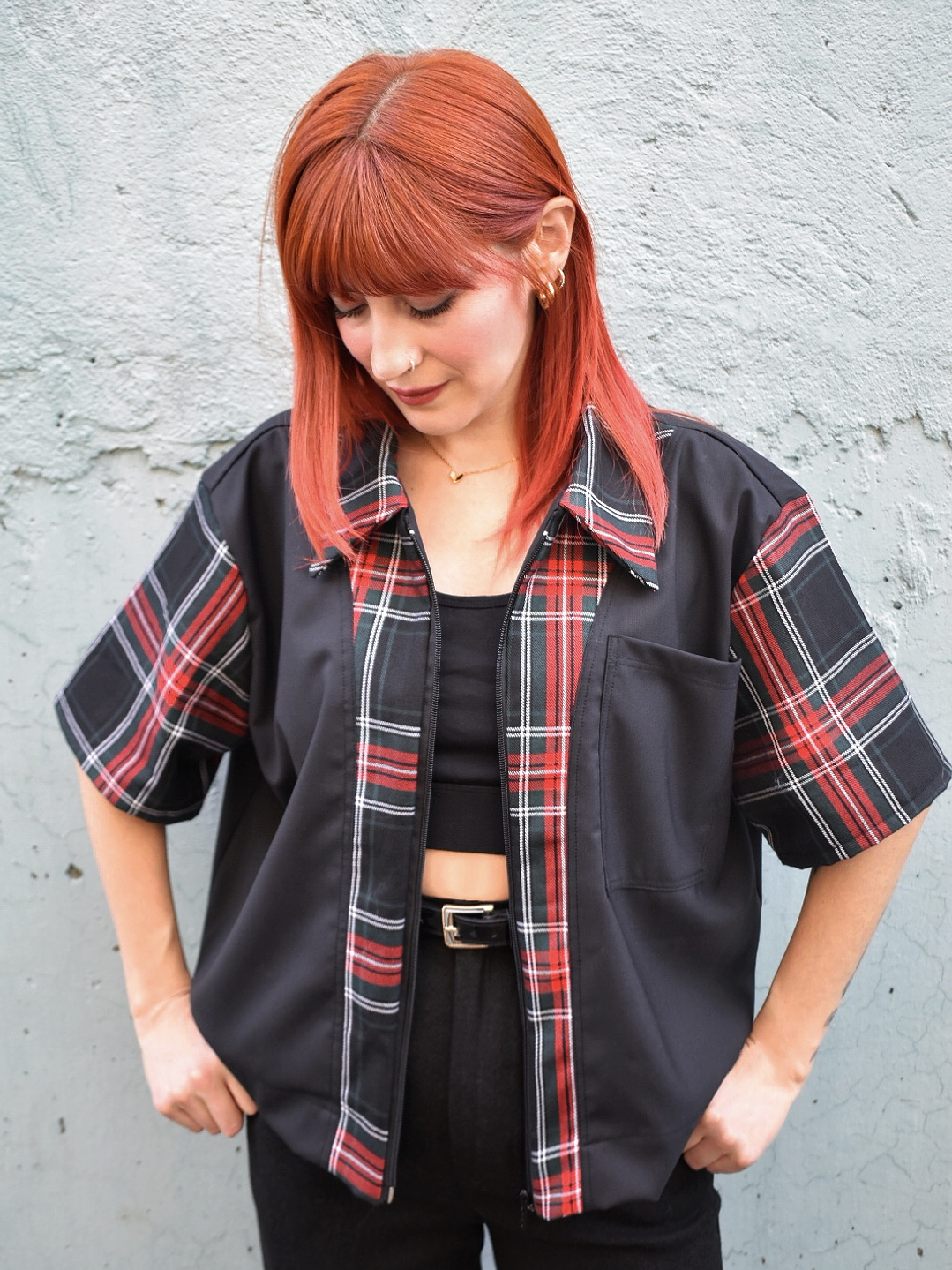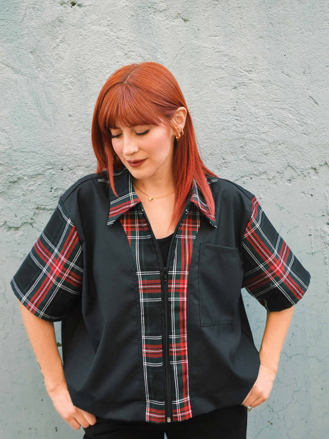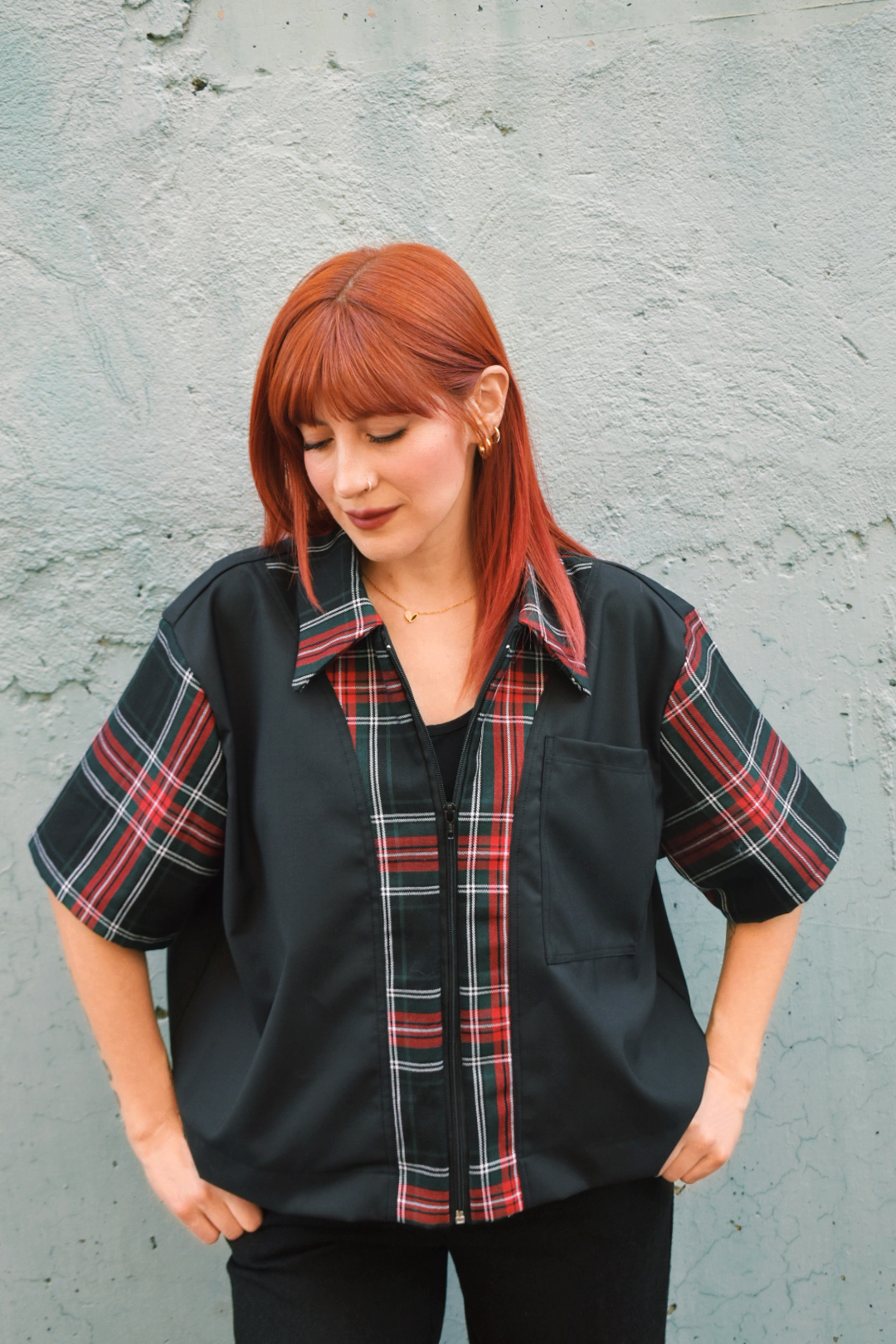 Camisa unisex en bloques en casimir delgado negro con escocés rojo en cuello, frente y mangas. Sensación fresca.