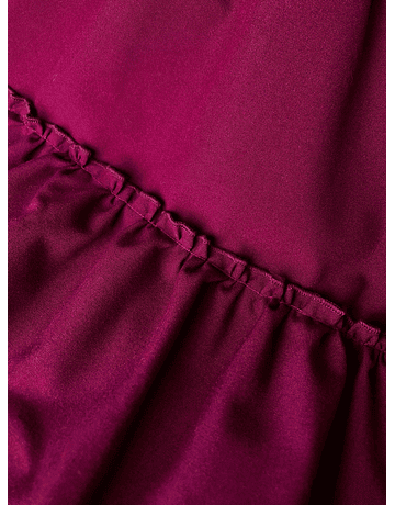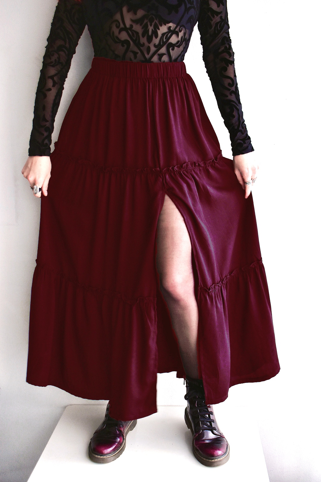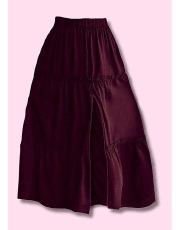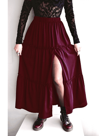 Maxi falda guinda en bloques recogidos con volumen, tela adecuada para otoño/invierno, cintura elasticada que puedes subir y pasar por tus caderas sin problema para su uso. La apertura sobre la pierna la hace realmente hermosa.